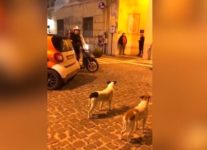 18世紀に建造された世界遺産カゼルタ宮殿で知られるイタリアのカゼルタ。石畳の広場からスクーターに乗って出かけようとする2人組を、二匹の犬が見張っています…